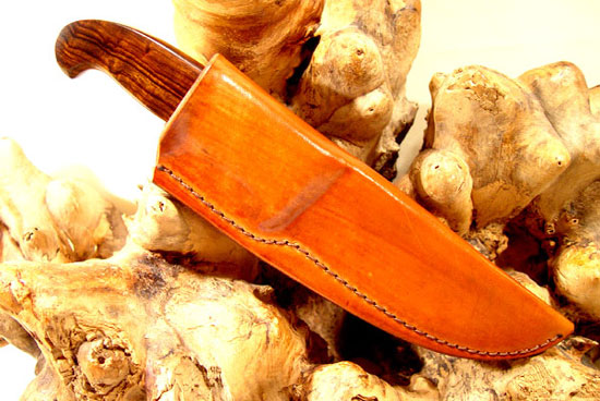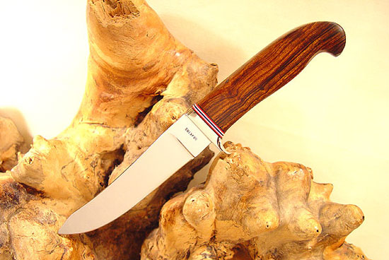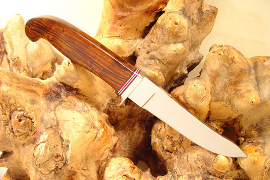 Blade Length: 5" Overall Length: 9 1/2" Blade Steel: 154CM Handle Material: Desert Iron Wood Bolster/Guard: Copper Nickel (70/30) Sheath/Pouch: Custom leather Price: US $395 plus shipping Warranty: My lifetime -- (abuse excluded) ID# RHFB2102 All Hawkins knives are handmade originals. Each one comes with a certificate of authenticity signed by Rade Hawkins!