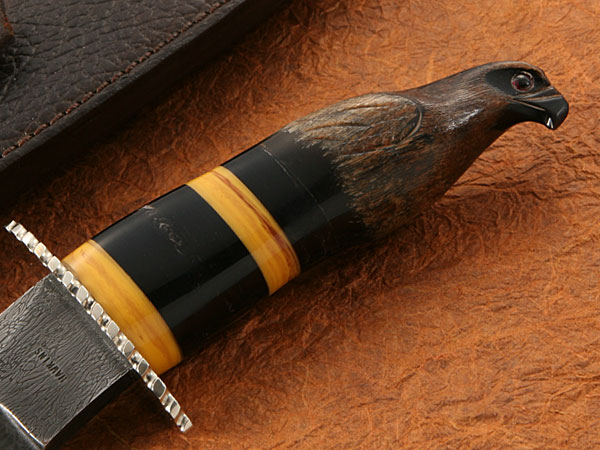 This is a hand-carved fighter, made with cable damascus, nickel-silver, buffalo horn and amber. The Hawk is my namesake bird and is carved into the handle butt of this broad fighter design. This knife comes with a custom fitted buffalo leather sheath. I am a Knifemakers' Guild voting member and warranty my work for life.