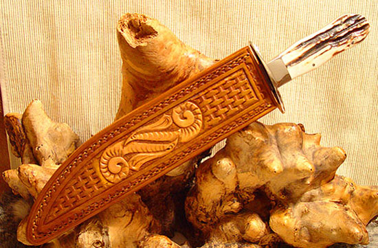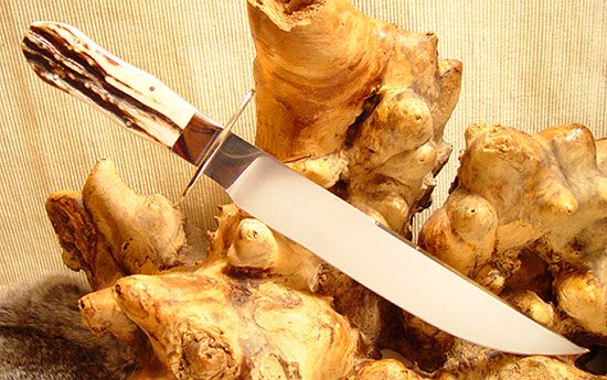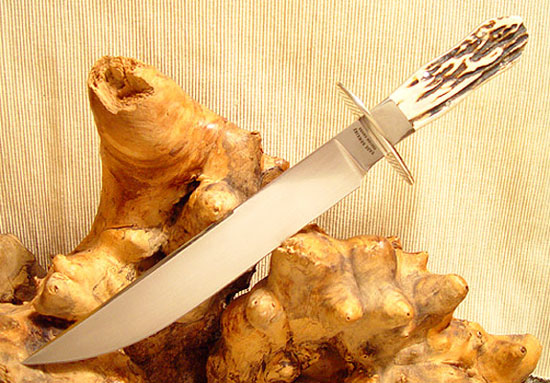 CLASSIC BOWIE This blade was hand forged from 1084 bar stock, flat ground then hand sanded. The narrow tang is wrapped with 1/4" thick copper nickel with copper nickel bolsters and guard. (Details) Blade Length: 9-3/4 Overall Length: 14-1/4 Blade Steel: Forged 1084 carbon steel Handle Material: Sambar stag Bolster/Guard: Copper-nickel Sheath/Pouch: Custom hand tooled leather by Sandy Morrisey Price: US $825 plus shipping Warranty: My lifetime -- (abuse excluded) ID# RHFBCB All Hawkins knives are handmade originals. Each one comes with a certificate of authenticity signed by Rade Hawkins!