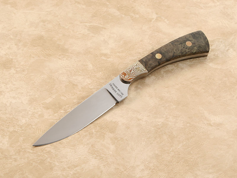 This rifleman's knife is embellished with mokume bolsters and has dyed, stabilized black ash burl handles.