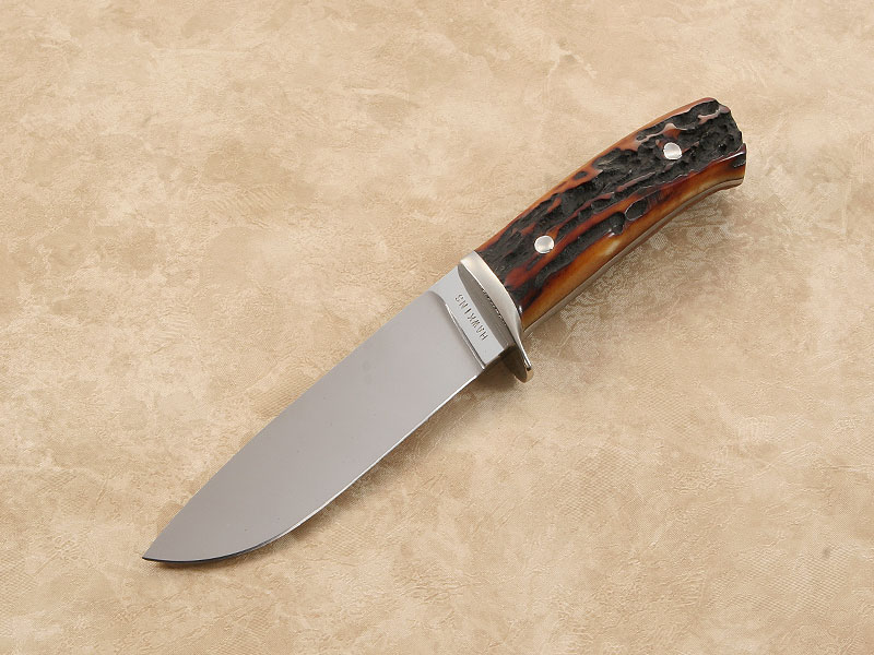 LARGE MAGNUM HUNTER. PREMINUM AMBER STAG HANDLE. TAPERED TANG MIRROR FINISH EXCELLENT FIT AND FINISH. CRYO TREATED 154 CM. HEAVY DUTY FITTED LEATHER SHEATH