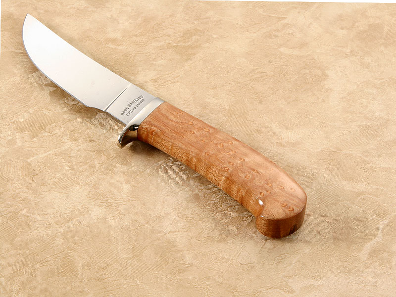 THIS TRAILING POINT SKINNER IS FORGED FROM 1084 STEEL. BLADE HAS A HAND RUBBED FINISH WITH A NICE BIRDSEYE MAPLE HANDLE. Great Working Knife.
